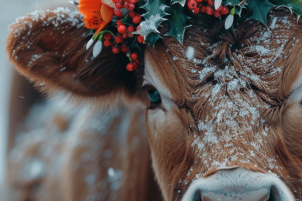 In een magisch moment van rust presenteert deze foto een koe uit het Zwarte Woud getooid met een weelderige krans van wilde bloemen. De zorgvuldig geselecteerde kleuren van de krans vormen een prachtig contrast met de crèmekleurige vacht van het dier en stralen een sfeer van vreugde en landelijke viering uit. De twinkelende lichtjes op de achtergrond benadrukken het kleurrijke landschap en nodigen de kijker uit om zich onder te dompelen in een wereld waar de natuur in al haar pracht wordt gevierd. Deze foto is niet alleen een eerbetoon aan het traditionele plattelandsleven, maar ook een uiting van levensvreugde en natuurlijke schoonheid, ideaal voor iedereen die verlangt naar een vleugje landelijke harmonie binnen zijn vier muren.