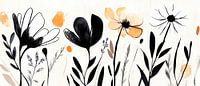Levendige bloemvormen dansen over een zachte achtergrond in harmonieuze zwarte, witte en delicate oranje tinten. Deze artistieke voorstelling brengt frisheid en levendigheid in de kamer en is perfect voor de woonkamer, waar het een uitnodigende sfeer creëert en gesprekken stimuleert. Een echte blikvanger voor bloemenliefhebbers!