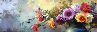 Bloemenpracht - Een levendig en impressionistisch bloemstilleven baadt in een spel van licht en schaduw, waarbij losse penseelstreken en een rijke variatie aan kleuren een bijna tastbare energie uitstralen. De compositie is gevuld met uitbundig geopende bloemen in tinten roze, paars en oranje, die elegant rusten in een sierlijk gevormde vaas, het geheel tegen een achtergrond met zachte, subtiele kleurtransities.