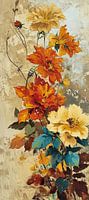 Bloemenpracht - Een levendige uitvoering van een bloementafereel in een impressionistische stijl, met een losse, expressieve penseelvoering die de bloemen tot leven wekt op een dynamische achtergrond. Het kleurenpalet is warm met tinten van oranje en geel, die mooi afsteken tegen de koelere blauwe en groene accenten, wat een natuurlijke en tegelijkertijd uitgesproken esthetiek oplevert.
