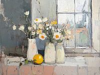 Bloemenraam | Fresh Bloom Morning Light - Dit bloemen schilderij toont een serene compositie van witte en gele bloemen in vazen, sereen geplaatst op een vensterbank met een enkele gele citroen en een impressionistisch uitzicht op een tuin door een rustiek raam.