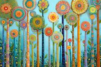 Bloemenrand | Flower Power - Dit is een kleurig bloemen schilderij met een overvloed aan vrolijke, ronde bloemen op lange stelen, die samen een speels en levendig bos creëren, met een zachte blauwe achtergrond die de kleuren accentueert.