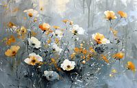 Bloemenschilderij Abstract | Fleeting Petal Dance - Dit bloemenschilderij toont een levendige compositie van klaprozen verstrooid over het doek. De bloemen, in tinten van oranje en wit, lijken te dansen op een achtergrond van wazige grijze en zilverachtige tonen, met subtiele hints van zwart. Kleine spatten van kleur suggereren wilde, energieke bewegingen, alsof de bloemen net door een zachte bries zijn geraakt. De bloemblaadjes van de klaprozen zijn zowel delicaat als dynamisch, met duidelijke centra waaruit fijne, donkere stempels oprijzen. De ondergrond voegt een textuur toe die rijk en tactiel is, waardoor een contrast ontstaat met de soepele botanische vormen. Dit bloemenschilderij is overwegend abstract met realistische kenmerken die samensmelten in een modern impressionistische stijl.