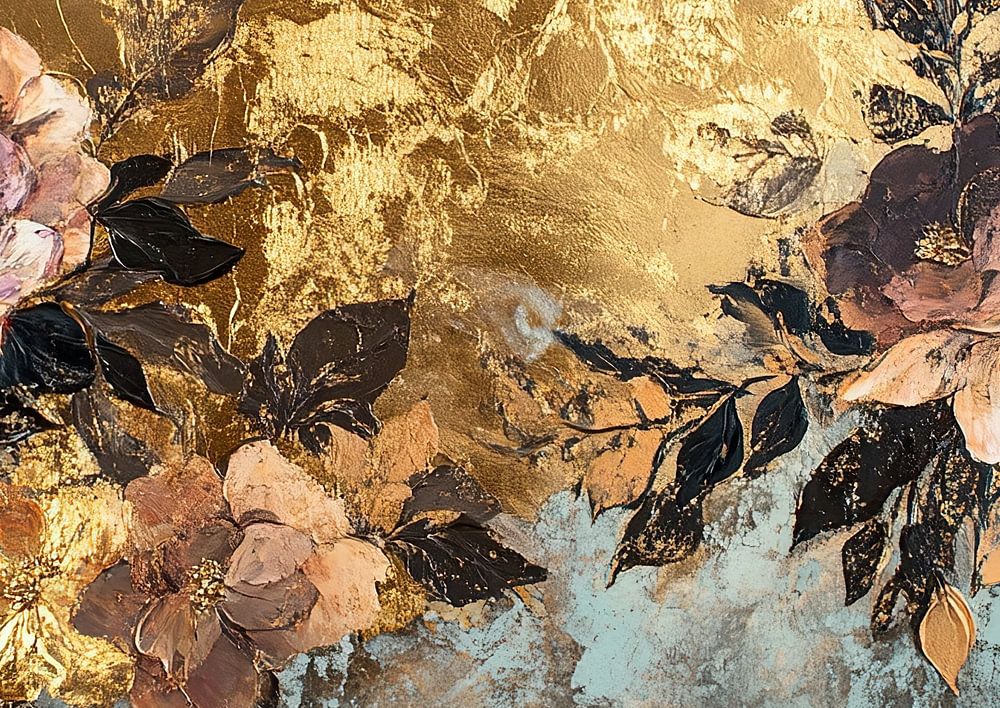 Bloemenschilderij | Gouden Bloei - Dit bloemenschilderij toont een rijke verzameling van weelderige bloemen, gedetailleerd weergegeven in tinten van roze en perzik tegen een glanzende gouden en ruwe blauwgrijze achtergrond, wat een moderne maar klassieke uitstraling geeft.