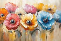 Bloemenschilderij | Kleurrijke Bloemen - Dit is een bloemen schilderij waarop grote, levendige bloemen in diverse kleuren zoals blauw, rood, geel en roze op een zacht getinte achtergrond staan, met een textuur die de verf dik en tastbaar maakt.