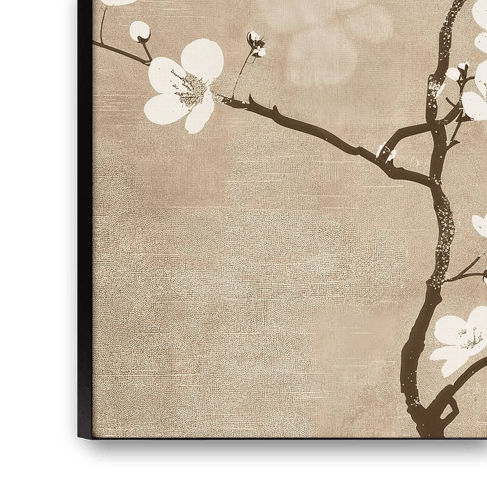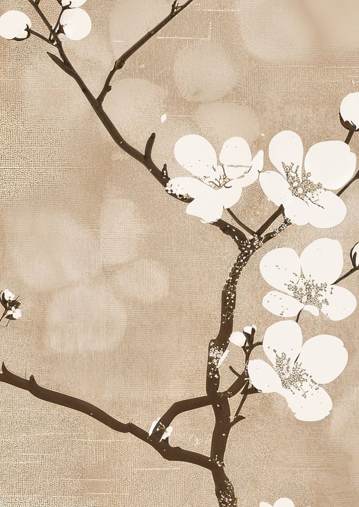 Details: bloemenschilderij, bloesem, tak, beige achtergrond, witte bloemen, bruine tak, linnen textuur, eenvoud, minimalisme, sereniteit