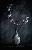 Een bloemenschilderij van een tak met bloemen in een vaas, tegen een prachtige donkere achtergrond geplaatst, straalt een tijdloze rust uit. De subtiele schaduwen en lichtspelingen zorgen ervoor dat de compositie tot leven wordt gebracht.