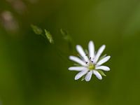 Een klein fonkelend wit bloemtje lijkt te zweven boven een groene zee. Helemaal alleen, zich verheffend uit de schaduw. Om alleen maar te doen waar het voor bedoeld is. Stralen. Zo hard het kan.