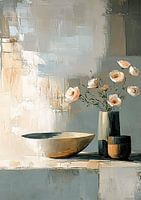 Bloemenstilleven | Still Beauty Echo - Dit bloemen schilderij toont een stilleven met elegante witte bloemen in een donkere vaas vergezeld door een ruwe goudkleurige schaal op een licht getextureerde ondergrond met grijze, blauwe en beige tinten.