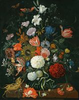 Bloemenstilleven in een vaas op een stenen rand met een maïskolf en een slak (Still Life of Flowers in a Vase on a Stone Ledge with a Corn Cob and a Snail), Jacob Rootius (1644-1681)