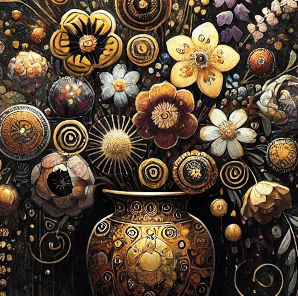 Een betoverend stilleven waarin bloemen en geometrische patronen samenkomen in een weelderige, gouden compositie. De warme gloed van het licht benadrukt de rijke details van de bloembladeren en de sierlijke vaas, die versierd is met intrigerende motieven. De artistieke stijl combineert klassieke elegantie met een modern, bijna magisch realisme, waardoor de bloemen lijken te stralen in een tijdloze harmonie.