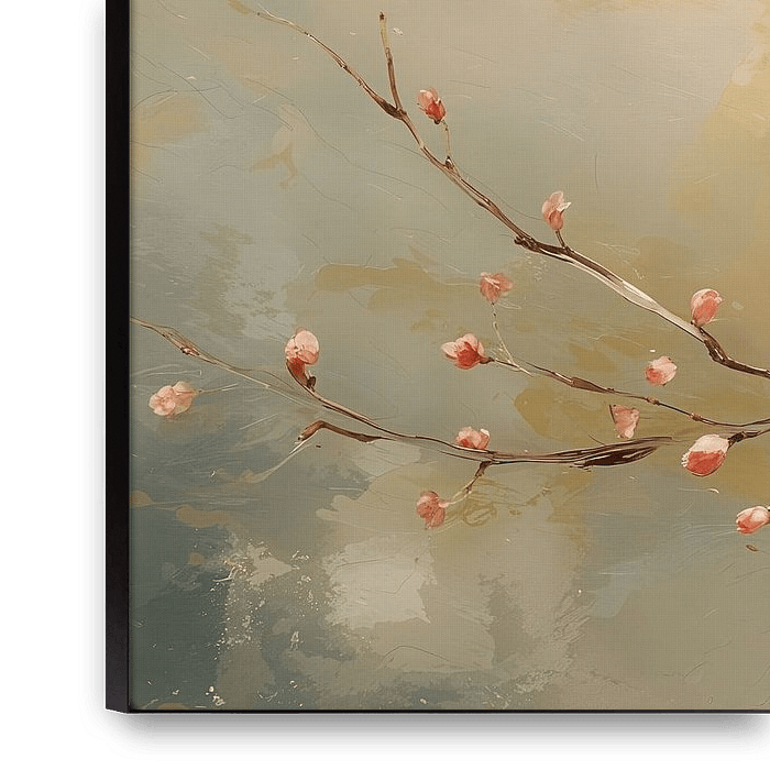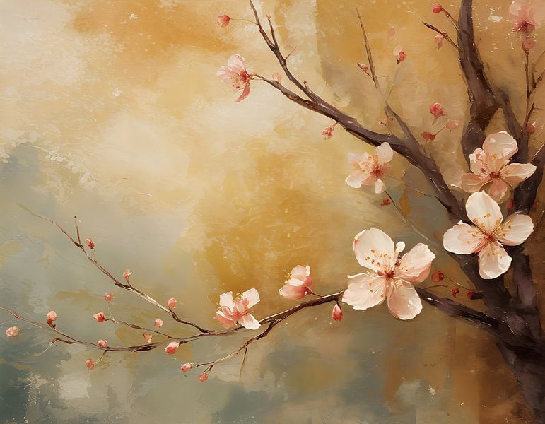 Deze bloesemtak is geschilder op een achtergrond met ruwe elementen en aardse kleuren. De warme kleuren zorgen bij mij voor een vriendelijke uitstraling en de kwetsbaarheid van de lieve bloesem stralen voorjaar uit. Voorjaar waarin nieuw leven wordt geboren en waarin de zon zich steeds vaker zal laten zien.