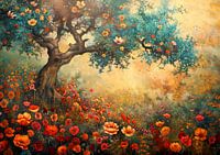 Het schilderij ademt een sfeer van sereniteit en harmonie, waarin de kijker wordt uitgenodigd om te dwalen door de weide van dromen en herinneringen. De oude boom staat daar als een tijdloos symbool van wijsheid en verbondenheid met de natuur, terwijl de kleurrijke bloemen het leven en de vreugde van het moment vieren.