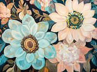 Bloementoets - Dit is een bloemenschilderij dat drie grote en levendige bloemen in de voorgrond toont, met een donkere, rijk gedetailleerde achtergrond van kleinere bloemen en bladeren.
