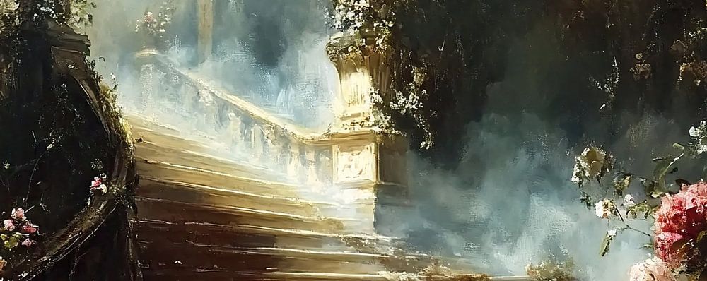Details: Rococo schilderij, bloemenschilderij, romantisch schilderij, stenen trap, roze rozen, witte rozen, tuinschilderij, klassieke kunst, olieverfschilderij, romantiek