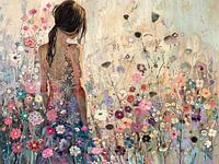 Bloementuin | Blossom Veil - Dit vrouwen schilderij toont een jonge dame van achteren gezien, omringd door een weelderige, kleurrijke bloementuin die bijna surrealistisch lijkt door de mix van natuurlijke en abstracte elementen.