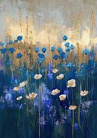 Bloementuin | Serenity in Sapphire and Gold - Dit bloemen schilderij toont een levendige verzameling van blauwe en witte bloemen tegen een achtergrond van goud en diepblauwe tinten, gecreëerd met dikke, expressieve verfklodders die een gevoel van diepte en textuur geven.