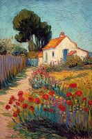Een expressionistisch schilderij met dikke verfstreken toont een idyllisch landelijk tafereel. Een wit huisje met oranje dak staat in een weelderige tuin vol felrode papavers en andere bloemen. Het tuinpad slingert tussen de bloembedden door, terwijl op de achtergrond donkergroene bomen tegen een turquoise hemel afsteken. De warme…