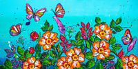 Gekleurde bloemen met vrolijk gekleurde vlinders van de kunstenaar Renate Rolefes.