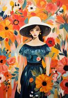 Bloementuin - Dit levendige schilderij toont een vrouwelijk figuur tegen een achtergrond van uitbundige bloemen. De stijl is een speelse mix van modern en impressionisme, met een rijk kleurenpalet van voornamelijk warme tinten oranje, rood, en pops van blauw. De losse, energieke penseelstreken geven een dynamisch gevoel aan het werk.