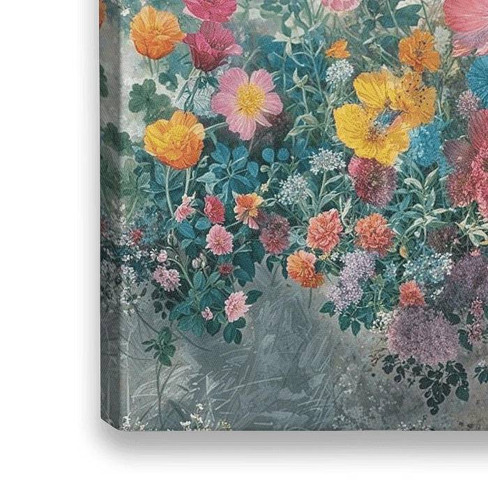 Bloementuin - Dit bloemenschilderij toont een weelderige collage van kleurrijke bloemen tegen een zacht neutraal achtergrond, waarmee een frisse en vrolijke sfeer wordt gecreëerd.