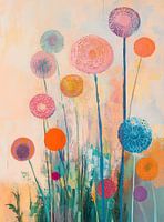 Bloementuin - Dit abstracte bloemenschilderij toont een reeks kleurrijke, cirkelvormige bloemen op lange, slanke stelen regelmatig verspreid over een canvas met een zachtoranje en lichtblauwe achtergrond.
