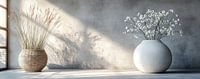 Bloemenvaas - Dit stilleven schilderij toont twee vazen met daarin een collectie wilde bloemen en grassen, waarbij de texturen van de vazen en de natuurlijke elementen prachtig uitkomen tegen een minimalistische, gestructureerde achtergrond.