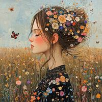 Bloemenveld | Bloemen Vrouw - In dit vrouwen schilderij zie je een jonge vrouw van opzij, met gesloten ogen en bloemen in haar haar, omringd door een veld vol bloemen en zwevende vlinders.