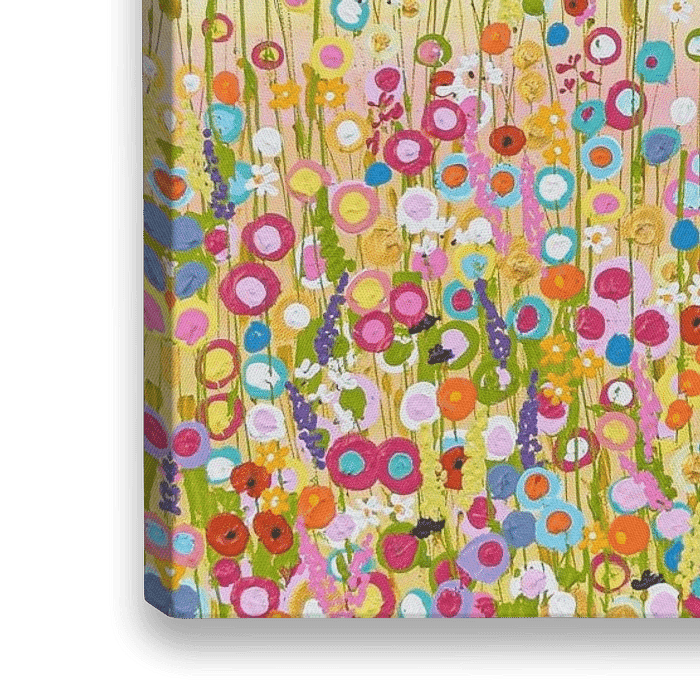Prachtig en kleurrijk schilderij van vrolijk bloemenveld. Handgeschilderd met acrylverf. Zorgvuldige kleurafstemming met een mooie zon en subtiele luchtschakering. Fine art meets pastel. True Joy. Kleurrijk. Pastelkleuren. Zon. Zomer. Lente.