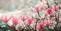 Abstract impressionistisch bloemenveld van een veld van magnolias met grove penseelstreken op canvas in roze, groen en natuurlijke tinten.