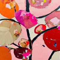 Gewaagde en kleurrijke benadering van het abstracte genre, waarin grote, levendige vormen en diepe zwart getinte lijnen elkaar ontmoeten op een zachtroze achtergrond. De compositie bestaat uit overlappende vormen die doen denken aan bloemen en bladeren, waarbij elke 'bloem' zorgvuldig is ingevuld met oranje, rood, beige en paars. De zwarte lijnen dienen als zowel structurele elementen die de vormen verbinden als visuele grenzen die de kleurrijke vormen scheiden en accentueren.