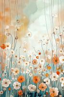 Een dromerige en poëtische weergave van een verkwikkend bloemenveld, waar tere maar ook felle bloemkleuren van wit, oranje en andere tinten zwevend samenkomen in een harmonieuze symfonie van vormen en lijnen, die een gevoel van vrede en sereniteit oproepen.