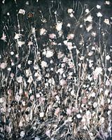 Wandelen in de ochtenddauw inspireerde me om deze foto te nemen. De bloemen fonkelen als sterren. Een groot formaat canvas schilderij vol energie en joie de vivre in de donkere nacht.