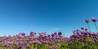 Panorama van bloemenveld met paarse bloemen en strakblauwe lucht