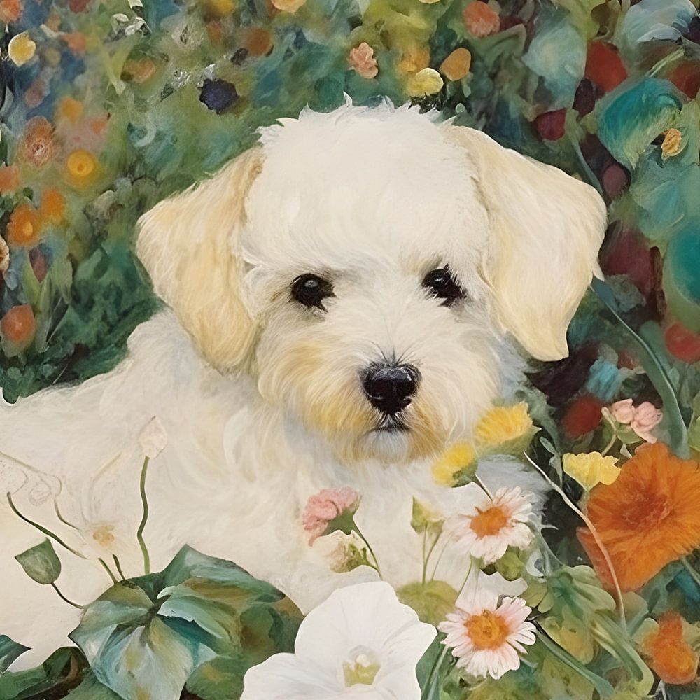 Bloemenveld met puppy in de stijl van Gustav Klimt