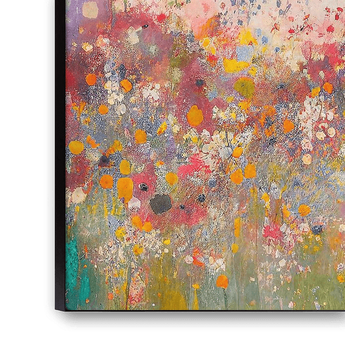 Abstract zijdeachtig bloemenveld van verfijnde kleine bloemetjes in diverse kleuren. Mooie surrealistische lichtinval. Vol van verbeelding en om bij weg te dromen. Bloemen. Bloemenzee. Klaproos, boterbloem, madeliefje. Bianca ter Riet