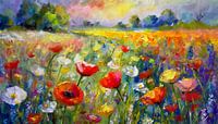 Zachte bloemen wuiven in een lentebries, doordrenkt met het gouden licht van de ondergaande zon. De weide straalt een kleurenpalet uit: rood, geel en lavendel. Dansende schaduwen werpen een betoverend schouwspel op de bloemrijke grond, terwijl de avond de wereld in een warme gloed hult.