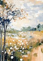 Bloemenveld - Dit landschapsschilderij toont een weelderig veld bezaaid met bloeiende witte en oranje bloemen tegen een achtergrond van abstracte blauwe en crèmekleurige luchten, wat een serene en textuurrijke natuurervaring weerspiegelt.