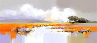 Bloemenveld - In één oogopslag grijpt die brede, vurige band van oranje je aandacht — alsof het veld zichzelf in brand heeft gezet en in vlekken en blokjes over het doek golft. Het is geen fotorealistisch bloemenveld, maar een abstracte weergave van kleurvakken en stippen die samen de illusie van een bloeiende vlakte geven. De kunstenaar koos voor die oranje strook als hart van het schilderij: warm, energiek, bijna luid in contrast met de rest van het werk. Daardoor voelt het landschap als een melodie met een luide refreinregel; je blijft terugkomen naar die kleurpartij die het ritme bepaalt. Een bloemenveld schilderij, maar dan gecomponeerd als een grafisch akkoord van kleur en beweging.