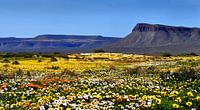 Bloemenvelden in Zuid Afrika. De natuur op zijn mooist. Gele, witte en oranje margrieten die midden in de natuur staan te bloeien.