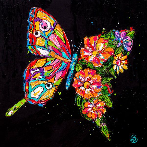 Kleurrijke vlinder op een zwarte achtergrond met veel verdikkingen van de kunstenaar Renate Rolefes.