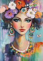 Details: vrouwenportret, kleurrijk schilderij, moderne kunst, portretschilderij, bloemen, groene ogen, kunst voor thuis,…