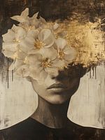 Bloemenvrouw | Elegante Bloemen Vrouw Portret - Dit vrouwen schilderij toont een elegante vrouw wiens gezicht verborgen is achter een rijk bloemenmotief met gouden accenten, geschilderd tegen een donkere, goud gespikkelde achtergrond.