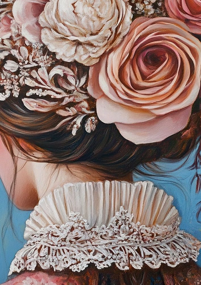 Bloemenvrouw | Elegante Bloemenhoed - Dit vrouwen schilderij toont een elegante dame gezien van achteren, haar hoofd rijkelijk versierd met een weelderige bloemenkrans bestaande uit grote rozen en fijne bloemetjes, tegen een zachte blauwe achtergrond.