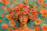 Bloemenvrouw | Eternal Spring's Beauty - Dit vrouwen schilderij toont een serene, gesloten-oog vrouw omgeven door een rijke, levendige bloemenkrans, bezaaid met kleurrijke vogels tegen een turquoise achtergrond.