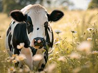 "Bloemenweelde" vangt een idyllisch moment van een koe te midden van een weide vol bloeiende bloemen. De zwart-witte vacht van de koe contrasteert prachtig met de delicate, witte madeliefjes en het zachte, gouden licht van een zomerochtend. De nieuwsgierige blik van de koe en de serene omgeving creëren een beeld van pure rust en natuurlijke schoonheid. Dit schilderij straalt de eenvoud en charme van het landelijke leven uit en is een perfecte aanvulling voor interieurs die een vleugje natuur en rustieke elegantie willen brengen. Ideaal voor liefhebbers van dieren en bloemen.