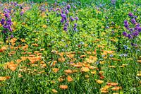 Verschillende bloemen, zoals de Californische klaproos, ook bekend als de gouden klaproos, calendula (goudsbloem) en kraanvogel in een bloemenweide in de lente op het eiland Reichenau in het Bodenmeer, Baden-Württemberg, Duitsland