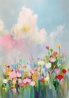 Abstract bloemenlandschap, voorjaarsbloemen in pastelkleuren, impressionistisch schilderij met zachte penseelstreken en een dromerige sfeer. De lucht is lichtblauw met wolken. Op de voorgrond is er een explosie van kleurrijke wilde bloemen, waaronder tulpen, madeliefjes, rozen, cosmea's, lelies, klaprozen en sunbirds. Het voelt alsof je…