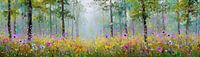 Achtergrond en techniek: de horizon verdwijnt in een zachte nevel, een lichte, koele mist die het landschap omhult en de kleuren iets doet flikkeren — precies die nevel creëert afstand en stilte. Het schilderij bloemenweide is een spel van warm tegen koel: warme bloemvlekken in het voorplan, koele, groene en grijsblauwe tonen in de verte. De penseelvoering varieert van stippen en spatten tot vloeiende lagen die elkaar deels bedekken; dat geeft het werk die moderne mix van impressionisme en lichte abstractie. Dit is een lente landschap dat tegelijk herkenbaar en verbeeldend is: een veld en een bos, maar vooral een moment van ademhaling in kleur.