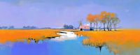 Bloemenweide - Dit schilderij vangt één helder moment: een brede, gouden weide die als een warme vacht over het landschap ligt en een smalle watergang die als een koele streep naar de horizon snijdt. De keuze om juist die twee elementen te laten domineren — het oranje-gele veld en de spiegeling van het water — zorgt voor een simpel maar doeltreffend spanningsveld. De weide voelt bijna tastbaar door de dicht opeengepakte verfpuntjes; de spiegeling daarentegen geeft ademruimte, een glanzende opening die het oog uitnodigt om verder te reizen richting een klein huisje en een slanke rij bomen in de verte. Dit is een bloemenweide schilderij én een spiegeling schilderij tegelijk: warm tegenover koel, rust tegenover beweging.